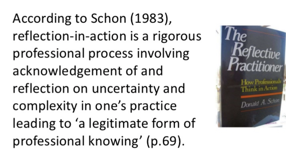 In reading the above papers, I found that neither referenced Donald Schon, who has written several of the most remarkable texts on reflection in the past several decades. Instead, both papers cited the work of John Dewey in which learning comes from reflecting on experience with emphasis on reflection after practice (i.e. reflection-on-action). For those who have read Schon, his works are anchored in Dewey — for example, Schon’s dissertation was on Dewey. However, pivoting from Dewey, Schon puts forward a new school of thought on professional practice that elevates experiential-intuitive practices. At the heart of Schon’s professional learning model is his conceptual framework of knowing-in-action and reflection-in-action. The former is tacit knowledge that is gained through doing, and such knowledge cannot be easily articulated or taught to others. The latter is an active and non-propositional process that is central in reframing or developing new knowing-in-action, which requires thinking about doing while doing simultaneously.